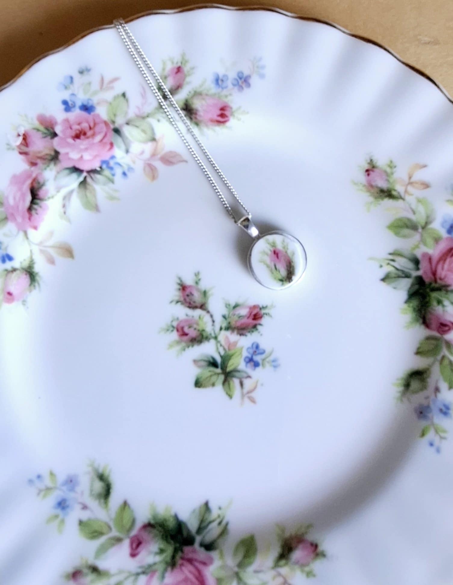 20th Anniversary Gift Broken China Rose Bud Pendant